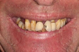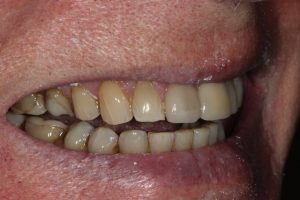 This treatment is usually carried out in 1 day (after a few preparatory appointments for moulds, x-rays, etc). The failing teeth were removed and implants place on the same day, with a temporary bridge (fixed teeth) attached also on the same day. Following a period of 3 to 6 months, moulds were taken and the definitive bridge placed