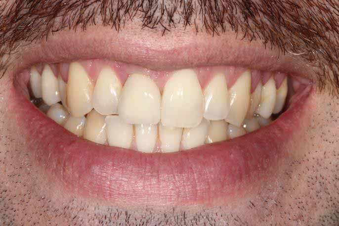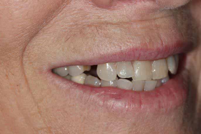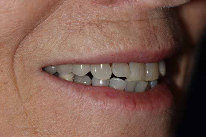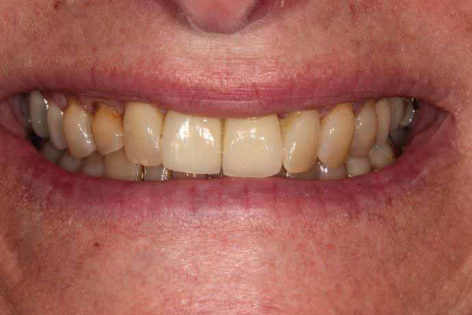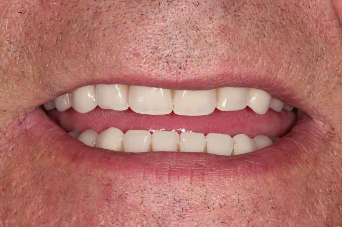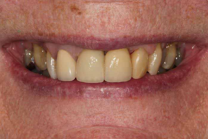 The failing upper left central incisor bridge was replaced with a dental implant, and the upper right central incisor veneered to help repair the worn surface and improve the overall aesthetics