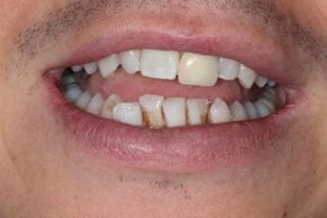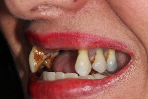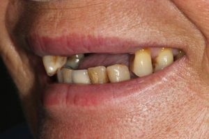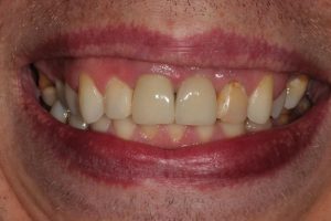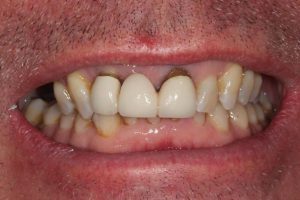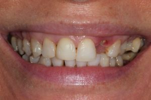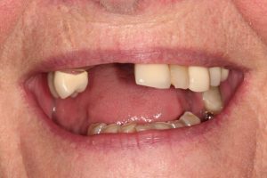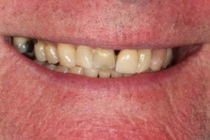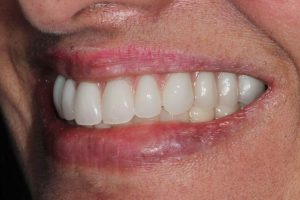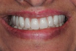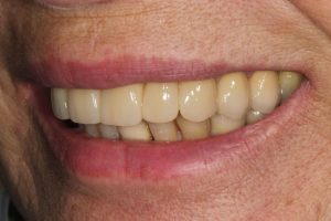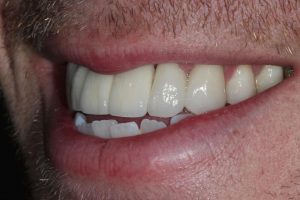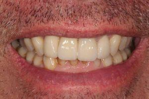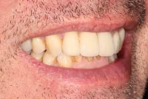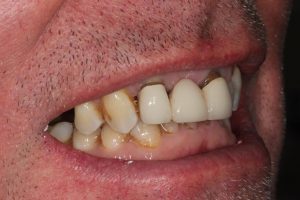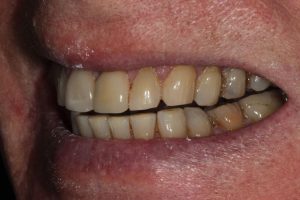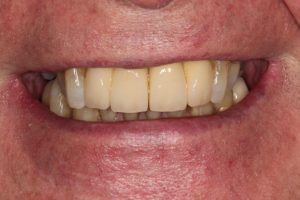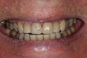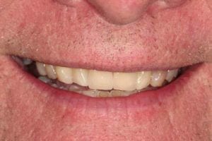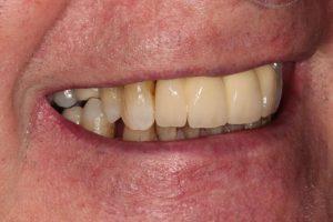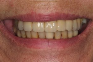 This treatment is usually carried out in 1 day (after a few preparatory appointments for moulds, x-rays, etc). The failing teeth were removed and implants place on the same day, with a temporary bridge (fixed teeth) attached also on the same day. Following a period of 3 to 6 months, moulds were taken and the definitive bridge placed