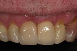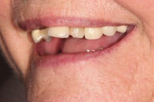 The upper left central and lateral incisors were no longer saveable, the patient also wanted to improve her smile. ‘Partial Extraction Therapy’ was undertaken to maintain small parts of the roots to prevent any loss of gum height/position. Along with a bridge and crown treatment, her smile was dramatically improved. Watch ‘Partial Extraction Therapy’.