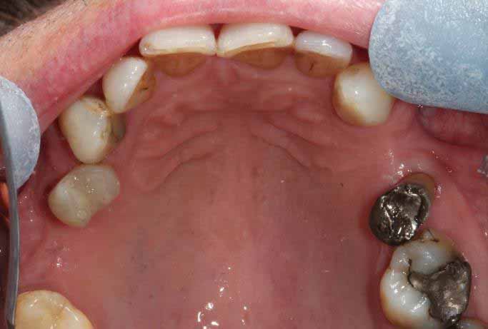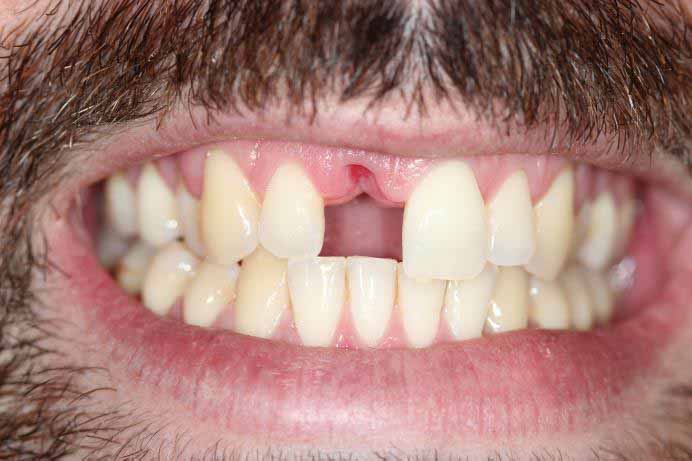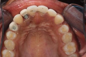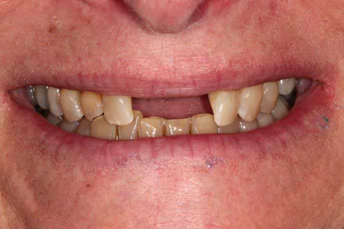 The missing upper left central incisor was replaced with a dental implant and a new crown was made on the upper right incisor.