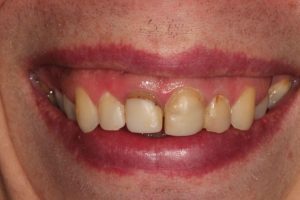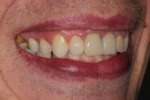 Both upper front teeth were in a bad way, the upper left one had to be removed as was beyond repair, this was replaced with an implant and a temporary crown on the same day; the upper right front tooth was repaired with a crown. Photos show the result with the definitive crowns after 3 months of treatment.