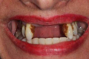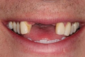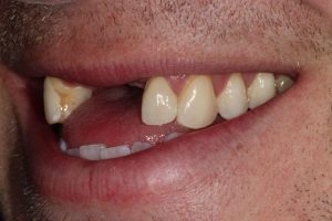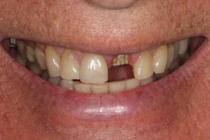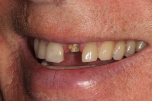 Both central incisors were broken, leaving just the roots. Unfortunately, there wasn’t enough tooth to repair these teeth and they were subsequently removed. Dental implants were placed to restore the missing teeth.