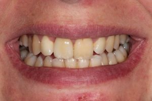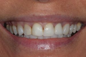 An old bridge had been in place for many years, but the shrinkage of the gums lead to the metal substructure becoming visible. The teeth either side of the missing upper right central incisor were restored with crowns, and the missing tooth was replaced with a dental implant. Not only did this improve the aesthetics, but now these teeth are no longer linked together. This means in the futures, if there are any problems with any of these teeth, they can be managed without disturbing the other teeth.