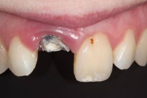 This patient had broken their upper front tooth and the exisitng dental crown had fallen off. The underlying root was unfortunatley irreparable.