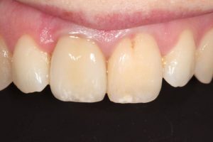 The upper left lateral incisor was broken and beyond repair, in order to prevent shrinkage of the gum (which can sometimes happen after tooth removal). A small part of the root was left in by undertaking a partial extraction (Socket shield), placing a dental implant and then a crown to fill the gap. This innovative treatment maintains a small piece of the root next to the dental implant (under the gum) so that the gum doesn’t shrink back and a long crown would have to be made to fill the space. This was especially important here as the patient’s gum line is visible when she smiles.